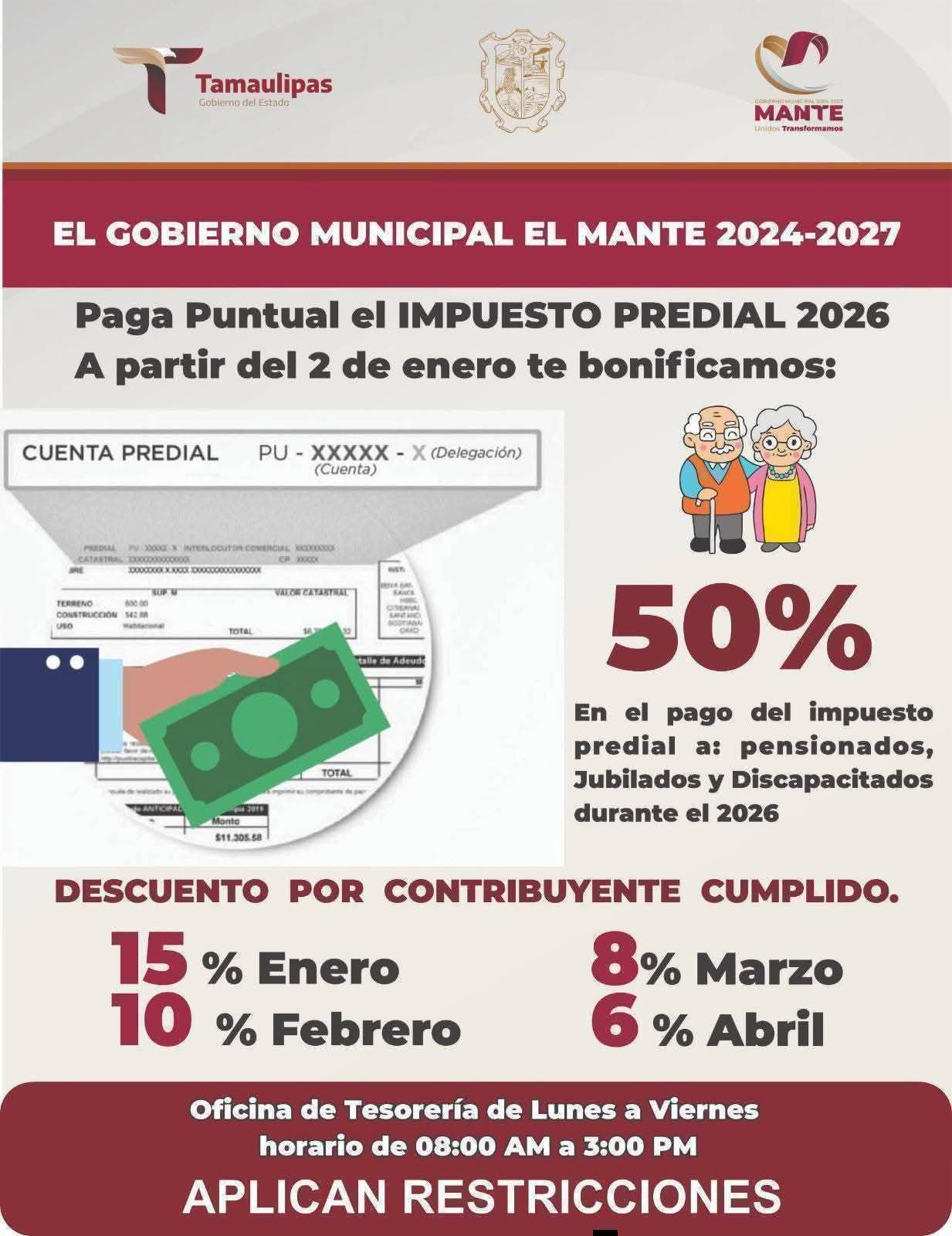 El Gobierno Municipal El Mante 2024-2027 te recuerda que abril es el último mes para obtener descuento en el pago del impuesto predial 2026.