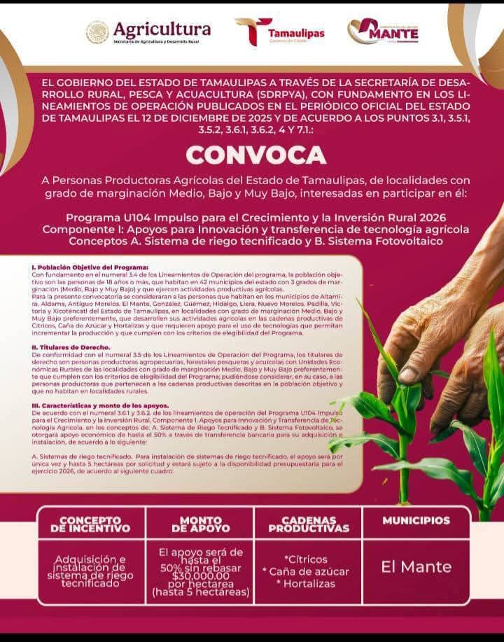 ¡Atención Productores Agrícolas! El Gobierno del Estado de Tamaulipas , a través de la Secretaría de Desarrollo Rural Pesca y Acuacultura en coordinación con el Gobierno Municipal El Mante 2024-2027 , te invita a participar en el Programa “Impulso para el Crecimiento y la Inversión Rural 2026”.