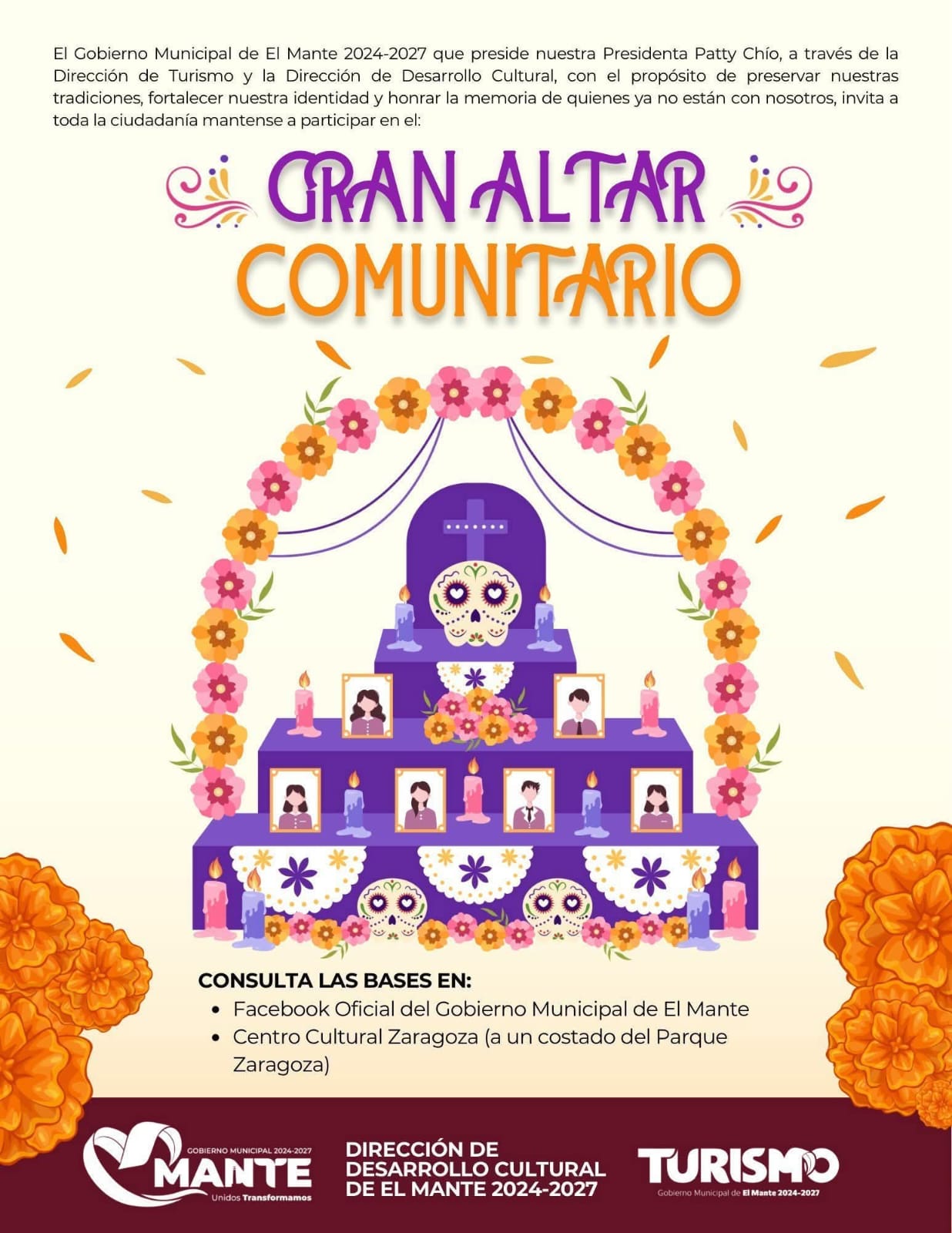 El Gobierno Municipal de El Mante 2024-2027 invita a toda la ciudadanía a rendir homenaje a nuestros fieles difuntos en el Gran Altar que se instalará en la plaza principal