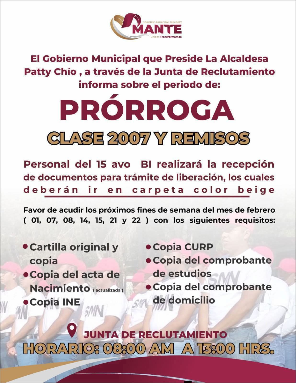 El Gobierno Municipal de El Mante 2024-2027, que preside la alcaldesa Patty Chío, a través de la Junta Municipal de Reclutamiento, informa a los jóvenes de la Clase 2007 y remisos sobre el periodo de prórroga para el trámite de liberación de la Cartilla del Servicio Militar Nacional.