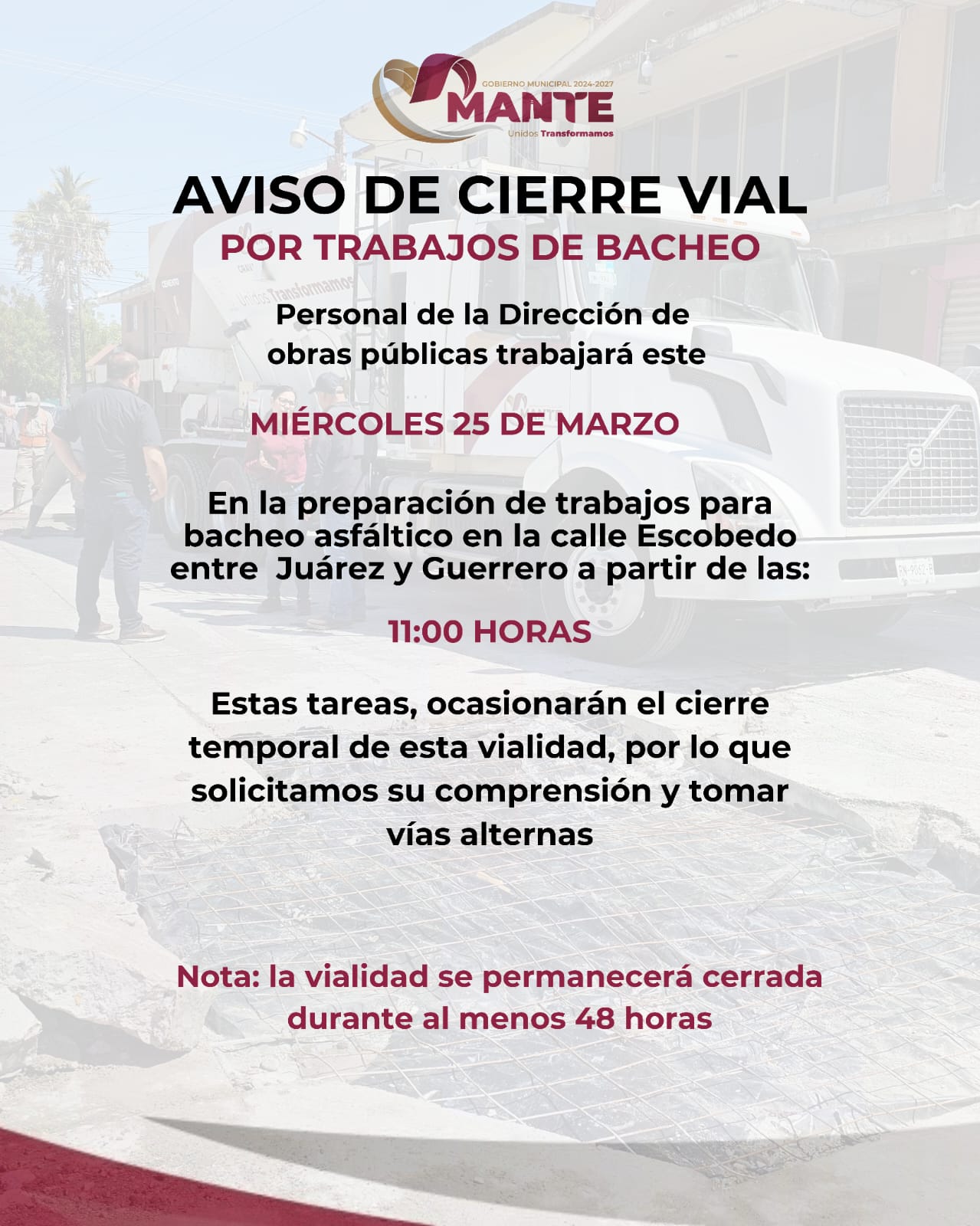 El Gobierno Municipal de El Mante informa que este miércoles 25 de marzo, a partir de las 11:00 horas, se realizarán trabajos de bacheo asfáltico en la calle Escobedo, entre Juárez y Guerrero.