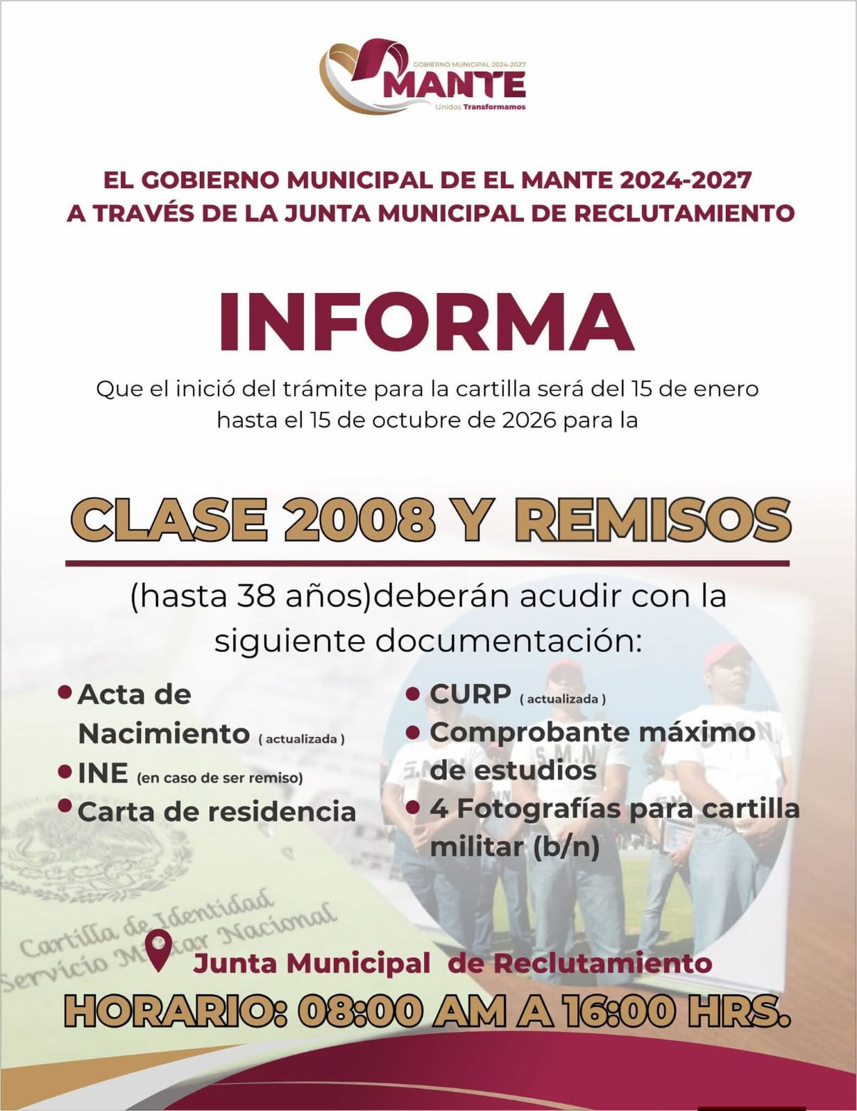 El Gobierno Municipal que encabeza Patty Chío informa a la ciudadanía que se encuentra abierto el periodo para el trámite de la Cartilla del Servicio Militar Nacional, dirigido a los jóvenes de la clase 2008, así como a remisos de hasta 38 años de edad.