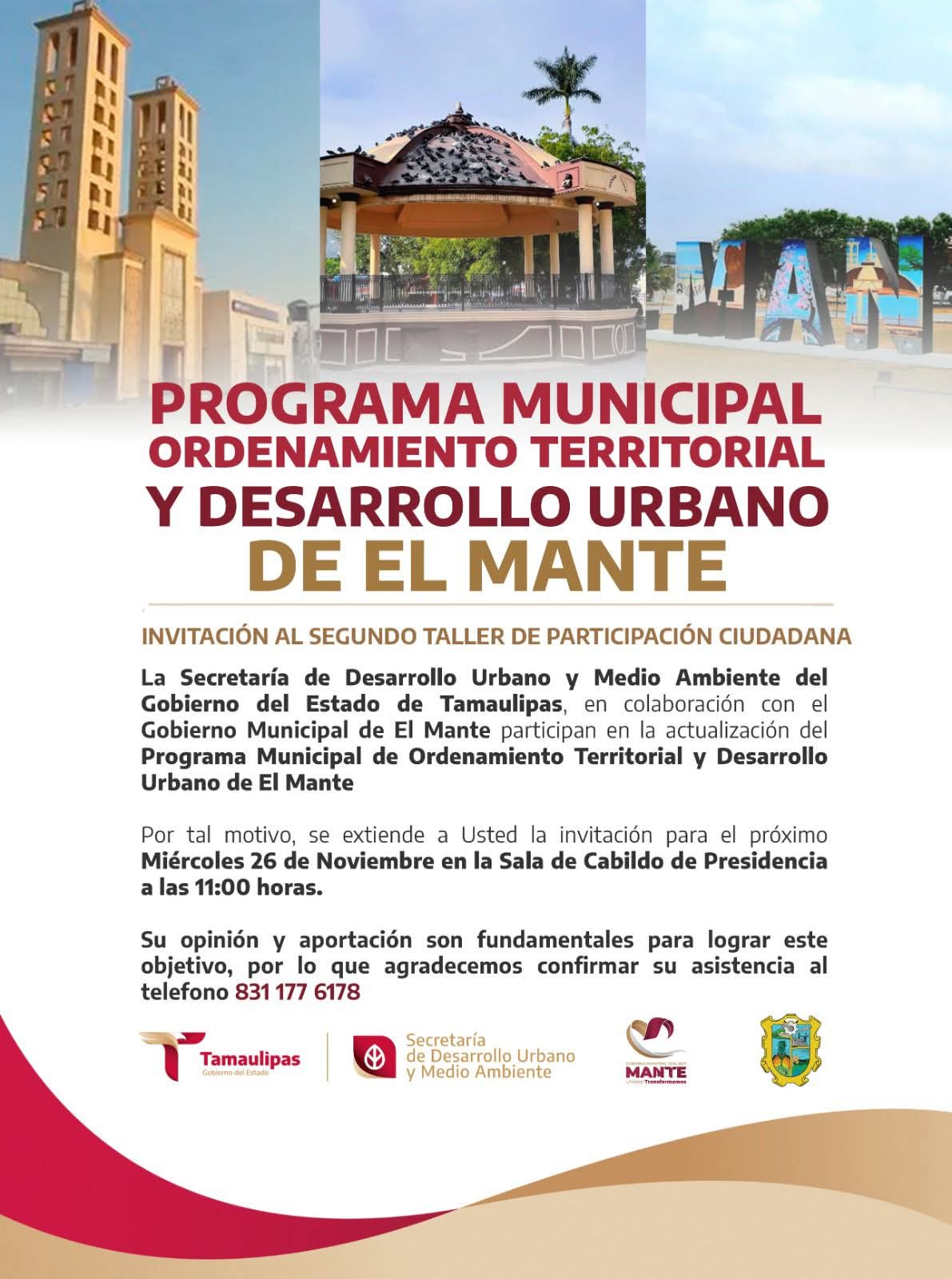 El Gobierno del Estado de Tamaulipas , a través de la Secretaría de Desarrollo Urbano y Medio Ambiente , en coordinación con el Gobierno Municipal El Mante 2024-2027 , continúa con los trabajos de actualización del Programa Municipal de Ordenamiento Territorial y Desarrollo Urbano de El Mante.