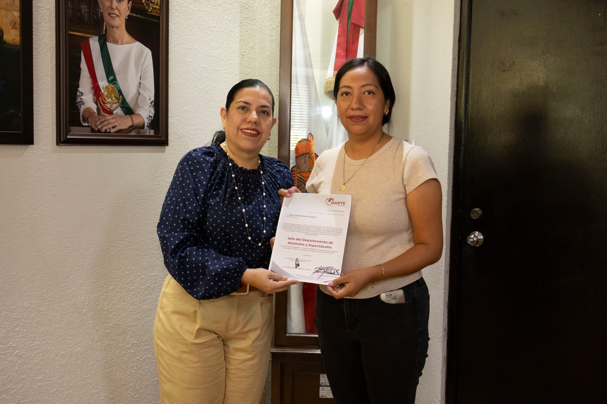 La Presidenta Municipal entregó el cargo de Encargado de Despacho de la Dirección de Tránsito y Vialidad a Jorge Tinajero García; Subdirector de Tránsito y Vialidad, Jorge Edehel Figueroa Alanís; Jefe de Compras y Adquisiciones, Carlos Alberto Cayetano Salazar; Administrador del Rastro Municipal, Isaac López Urbina; Jefa del Departamento de Alcoholes y Espectáculos, María Trinidad Muñoz Chagolla; y Javier Díaz Hernández como Subdirector de Protección Civil.
